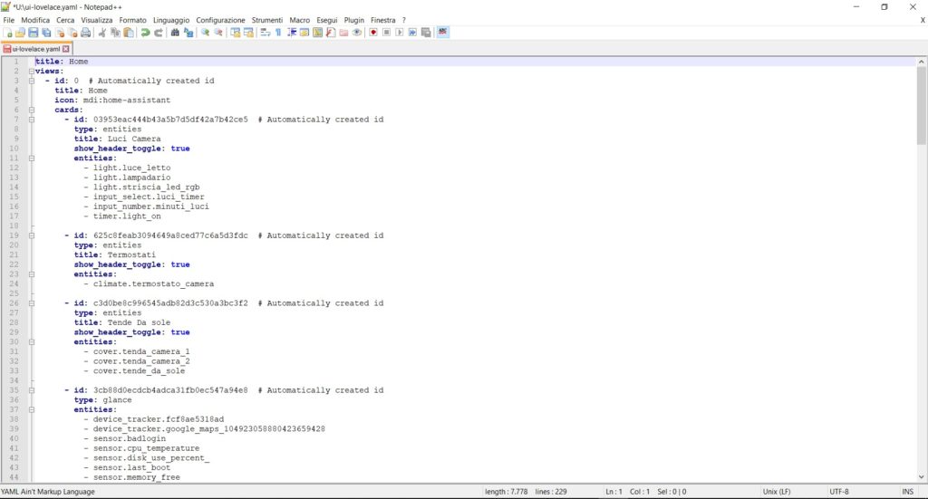 Per crearlo manualmente come prima cosa inseriamo questo codice che crea l’interfaccia e la prima pagina di lovelace